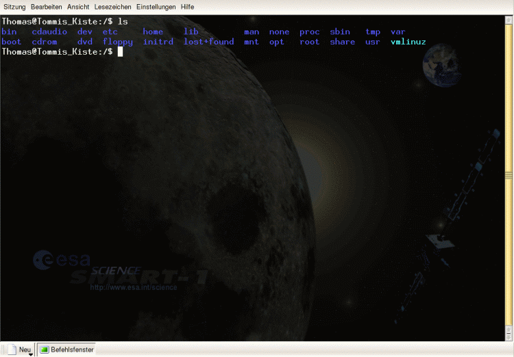 schneller, effizienter und leichter erledigen. Vorteile der Shell: Die eindeutigen Vorteile eines Kommandointerpreters sind seine Mächtigkeit und Schnelligkeit gegenüber grafischen Benutzerschnittstellen. Die Schnelligkeit wird z. B. bei der Datei-Suche mit dem Dateisuchprogramm locate deutlich. Die Suche nach einer beliebigen Datei wird auf einem durchschnittlichen Rechner kaum mehr als eine Sekunde (!) dauern. Es wird nämlich nicht umständlich die komplette Festplatte durchforstet, sondern nur eine einzelne Datei, in der alle Dateinamen des Systems aufgeführt sind. Das ist nur eines von vielen Highlights, die die Shell zu bieten hat. (Übrigens: Falls das System meckert, dass diese Datenbank älter als 8 Tage ist, so kann man diese mit dem Befehl updatedb aktualisieren.) Die Shell ist also ein guter Grund (von vielen), auf Linux umzusteigen. Sie ist wirklich eine "Killer-Applikation", die man so bei Windows vergeblich sucht (der DOS-Prompt ist, was Flexibilität und Mächtigkeit betrifft, bei weitem nicht mit einer Linux-Shell, wie z. B. der bash, zu vergleichen). GUIs haben bei bestimmten Anwendungen (Grafik, CAD) sicher ihre Vorteile, aber eine Shell ist zumindest bei der Bearbeitung von strukturierten Textdateien unverzichtbar. Immer häufiger müssen solche Textdateien bearbeitet werden, denn sie sind die Basis moderner deskriptiver Sprachen wie HTML, SGML oder XML. Die Erfahrung zeigt, dass Textdateien viel leichter und eleganter von einer Shell aus bearbeitet werden können als mit einem GUI ("Graphical User Interface"). Unter Linux ist die sog. "Bourne Again Shell" ("bash") sehr populär. Die bash ist die Nachfolgerin der "Bourne-Shell" ("sh"), die nach ihrem Erfinder Steve Bourne benannt ist. Übrigens: Der Übergang vom GUI zur Shell bedeutet nicht unbedingt einen Rückschritt zum tristen DOS-Prompt-Look. Die Einstellungen ermöglichen es, ein Desktop-Hintergrundbild durchschimmern zu lassen (sieht sehr edel aus!). |